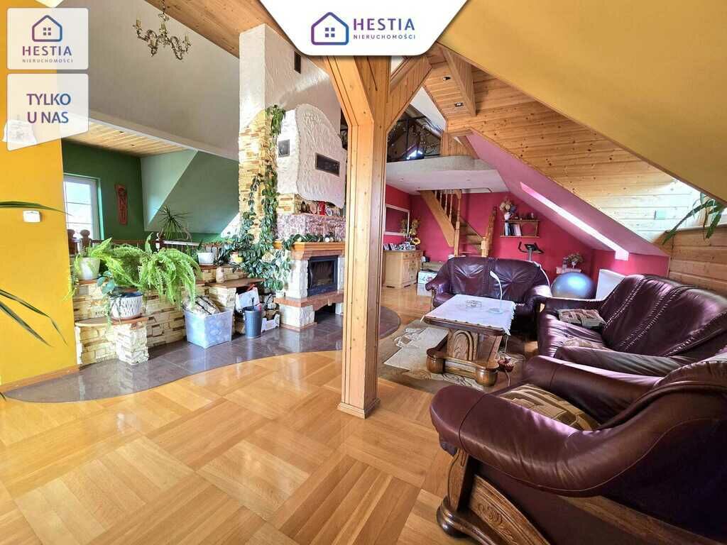 Piętro to przestronny salon z kominkiem, sypialnia, antresola,